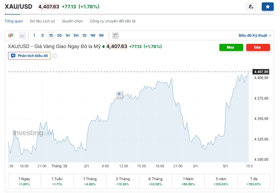Sáng đầu phiên giao dịch ngày 5/1/2026, giá vàng thế giới tiếp tục neo ở mức rất cao và có xu hướng tăng so với cuối tuần trước. Trên thị trường quốc tế, vàng giao ngay trong phiên sáng đầu tuần dao dịch quanh 4.370-4.400 USD/ounce, tăng vọt khoảng 40-70 USD/ounce, tương đương hơn 1,5% so với giá đóng cửa tuần trước (4.332 USD/ounce).