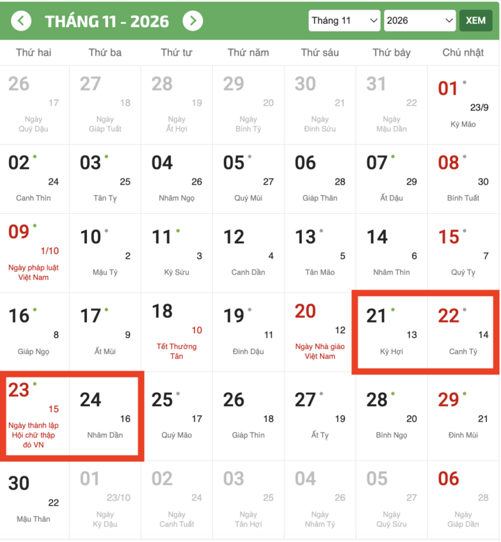 Năm 2026, ngày 24/11 rơi vào thứ Ba, đồng nghĩa công chức, viên chức, người lao động sẽ có một ngày nghỉ giữa tuần. Tuy nhiên, nhiều người lao động đang bày tỏ hy vọng các cơ quan chức năng sẽ xem xét phương án hoán đổi ngày làm việc thứ Hai (23/11), bố trí đi làm bù vào thời điểm phù hợp.