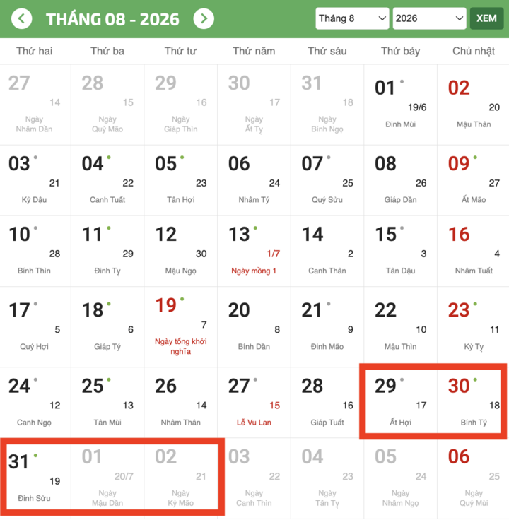 Như vậy, kỳ nghỉ lễ Quốc khánh năm 2026 bắt đầu từ thứ Bảy 29/8 đến hết thứ Tư 2/9, tổng cộng là 5 ngày (gồm 2 ngày nghỉ lễ Quốc khánh theo quy định, 2 ngày nghỉ cuối tuần và 1 ngày được hoán đổi).
