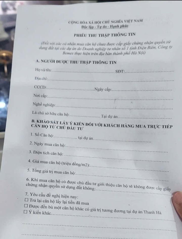 Trong phiếu, hai phương án chính được đưa ra gồm: Trả lại căn hộ để nhận lại tiền đã mua; Được đền bù bằng một căn hộ khác có giá trị tương đương tại Khu đô thị Thanh Hà. Người dân đồng ý với phương án nào thì tích vào phương án đó. Trường hợp không đồng ý với 2 phương án này thì người dân có bất kỳ ý kiến, mong muốn nào sẽ ghi vào mục ý kiến khác.