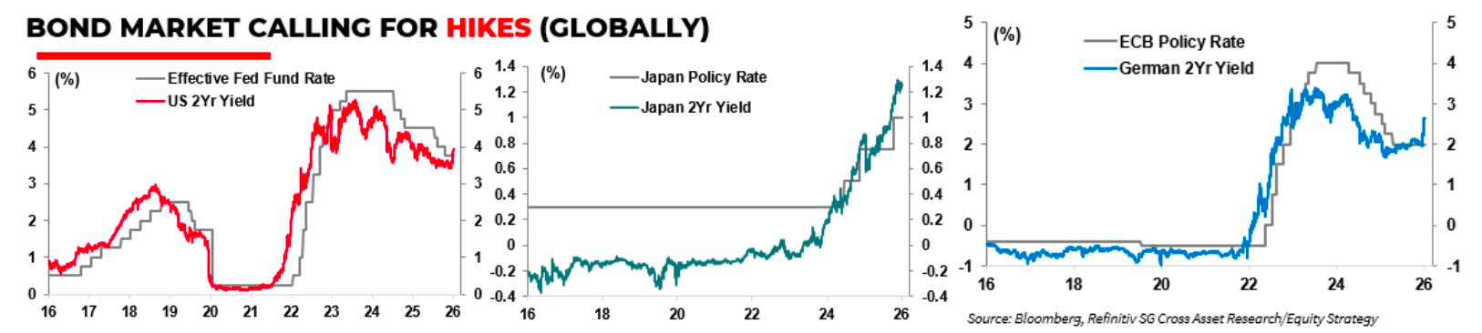Cùng với diễn biến từ cuộc xung đột, thị trường trái phiếu cũng đang phát đi tín hiệu tăng lãi suất dưới áp lực lạm phát do tác động đứt gẫy nguồn cung. Khi lạm phát tăng trở lại trong khi thất nghiệp vẫn ở mức thấp, FED và các NHTW sẽ thận trọng hơn trong việc hạ lãi suất nhìn từ bài học 2022.