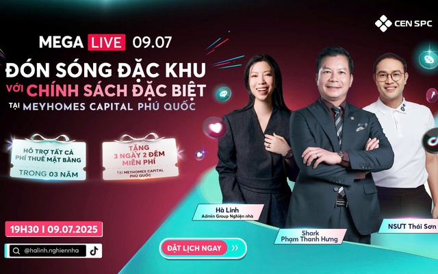 Vào lúc 19h30 ngày 09/07/2025, phiên Mega Live với chủ đề "Đón sóng đặc khu với chính sách đặc biệt tại Meyhomes Capital Phú Quốc" sẽ chính thức lên sóng trên kênh TikTok @halinh.nghiennha.