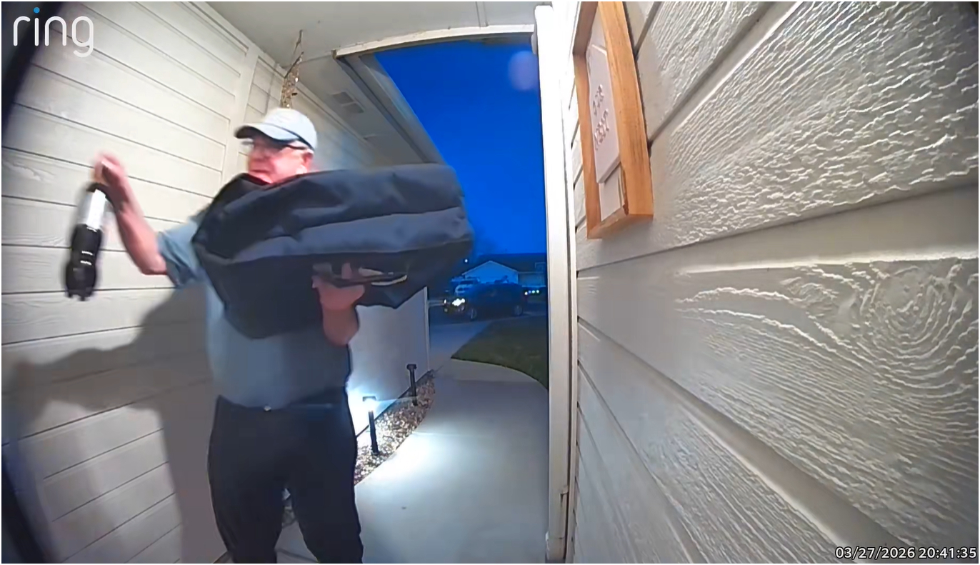 Đính kèm là đoạn video trích xuất từ camera trước cửa nhà, ghi lại khoảnh khắc nam shipper đến giao hàng vào lúc 21h41 tối 27/3.