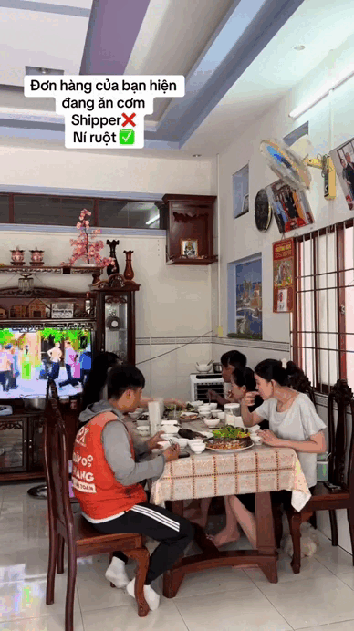 Dạo một vòng trên MXH, dễ nhận ra một điều rằng shipper ở miền Tây có thể lo nắng lo mưa khi chạy ship cả ngày dài, chứ tuyệt nhiên chẳng bao giờ phải lo... đói bụng. Bởi ở đây, chuyện shipper được khách mời vào nhà ăn cơm đã trở thành điều rất đỗi quen thuộc. Thậm chí, nếu đúng thời điểm nhà đang có cỗ có tiệc, có khi shipper còn được rủ rê “nhập hội” luôn, ngồi xuống dùng bữa như người thân trong gia đình. Trên MXH, không khó để bắt gặp những video ghi lại khoảnh khắc shipper miền Tây "ăn ké" bữa cơm cùng khách, luôn thu hút nhiều lượt tương tác vì sự thú vị và gần gũi. Có thể thấy, chỉ cần thêm đôi chén đôi đũa là đôi bên có thể ngồi ăn với nhau rất tự nhiên, như bạn bè lâu ngày gặp lại.