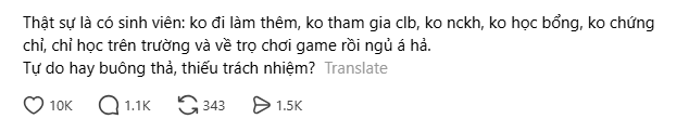 Mới đây, một bài đăng trên Threads đã làm bùng nổ những tranh luận trái chiều khi đặt câu hỏi về một bộ phận “sinh viên tối giản hoạt động”. Theo đó, người đăng đặt vấn đề khá thẳng thắn là có những sinh viên không đi làm thêm, không tham gia câu lạc bộ, không nghiên cứu khoa học, không săn học bổng hay chứng chỉ, chỉ học trên trường, rồi về nhà chơi game, nghỉ ngơi. Câu hỏi đi kèm là: "Đó là tự do hay buông thả, thiếu trách nhiệm?".