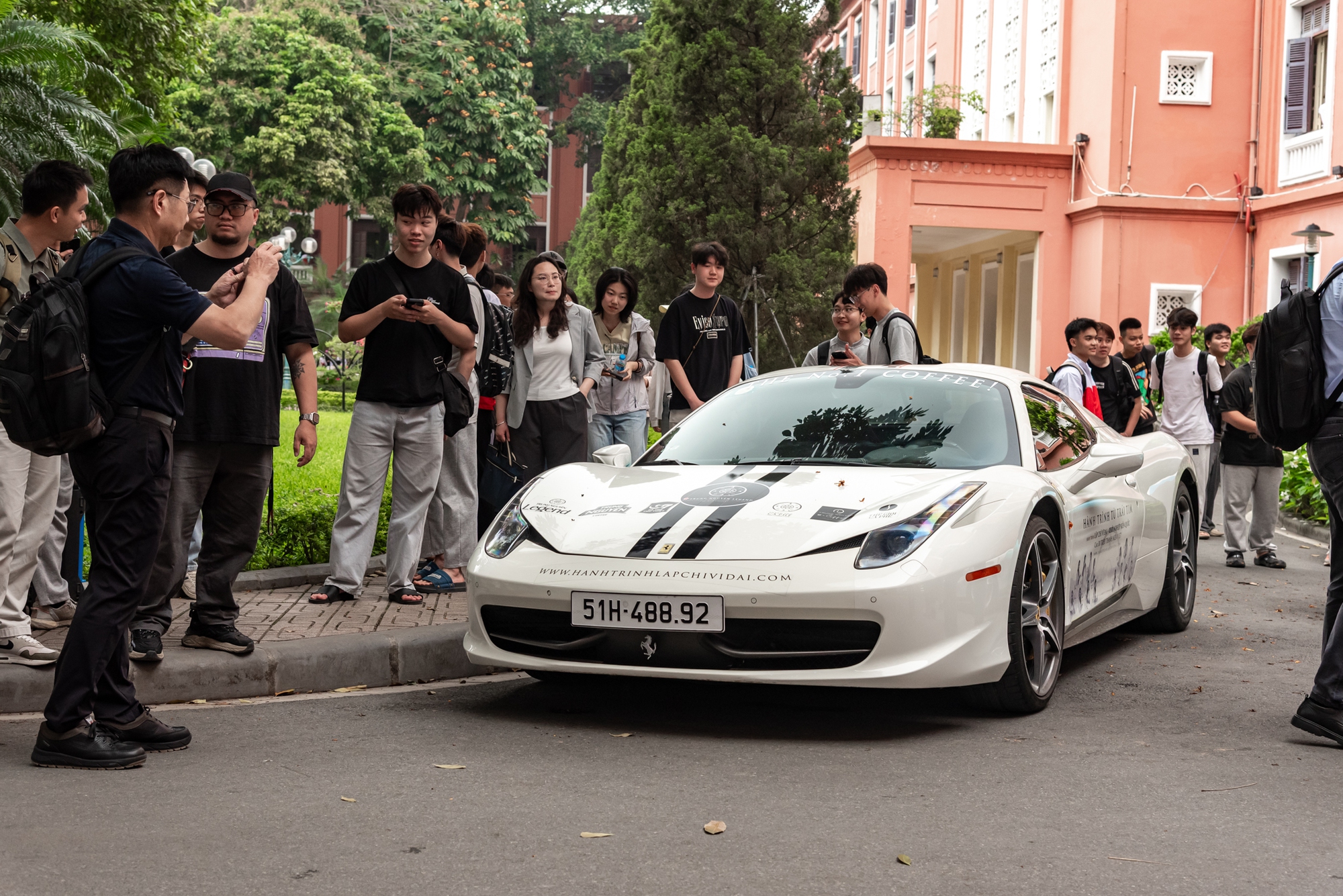 Ngay khi vừa tiến vào khuôn viên Học viện Chính sách và Phát triển cùng Trường Đại học Thủy lợi, dàn xe đã lập tức trở thành tâm điểm thu hút hàng trăm ánh nhìn. Nhiều bạn sinh viên không giấu được sự ngạc nhiên, tới gần những chiếc Ferrari mui trần để chiêm ngưỡng tận mắt những “cực phẩm” vốn hiếm khi xuất hiện cùng lúc trên đường phố. Vẻ ngoài long lanh của dàn xe giữa không gian giảng đường tạo nên một cảnh tượng hiếm thấy, khiến nhiều bạn trẻ hào hứng dùng điện thoại ghi lại những khoảnh khắc đặc biệt này.