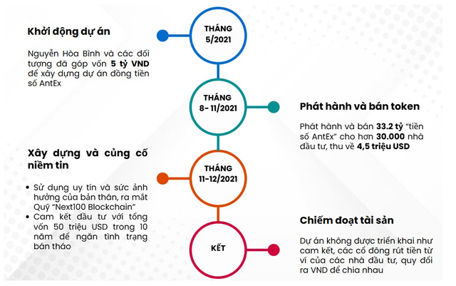 Mặc dù dự án triển khai không đúng như lộ trình đề ra nhưng ông Bình và các cổ đông của công ty NextTech đã thống nhất rút tiền từ ví tổng của Dự án AntEx, chuyển vào ví điện tử của một số cá nhân trong dự án rồi bán quy đổi ra VND để chia nhau, ngoài ra còn chuyển vào các công ty trong hệ sinh thái của công ty NextTech để sử dụng không đúng mục đích đối với số tiền của các nhà đầu tư.