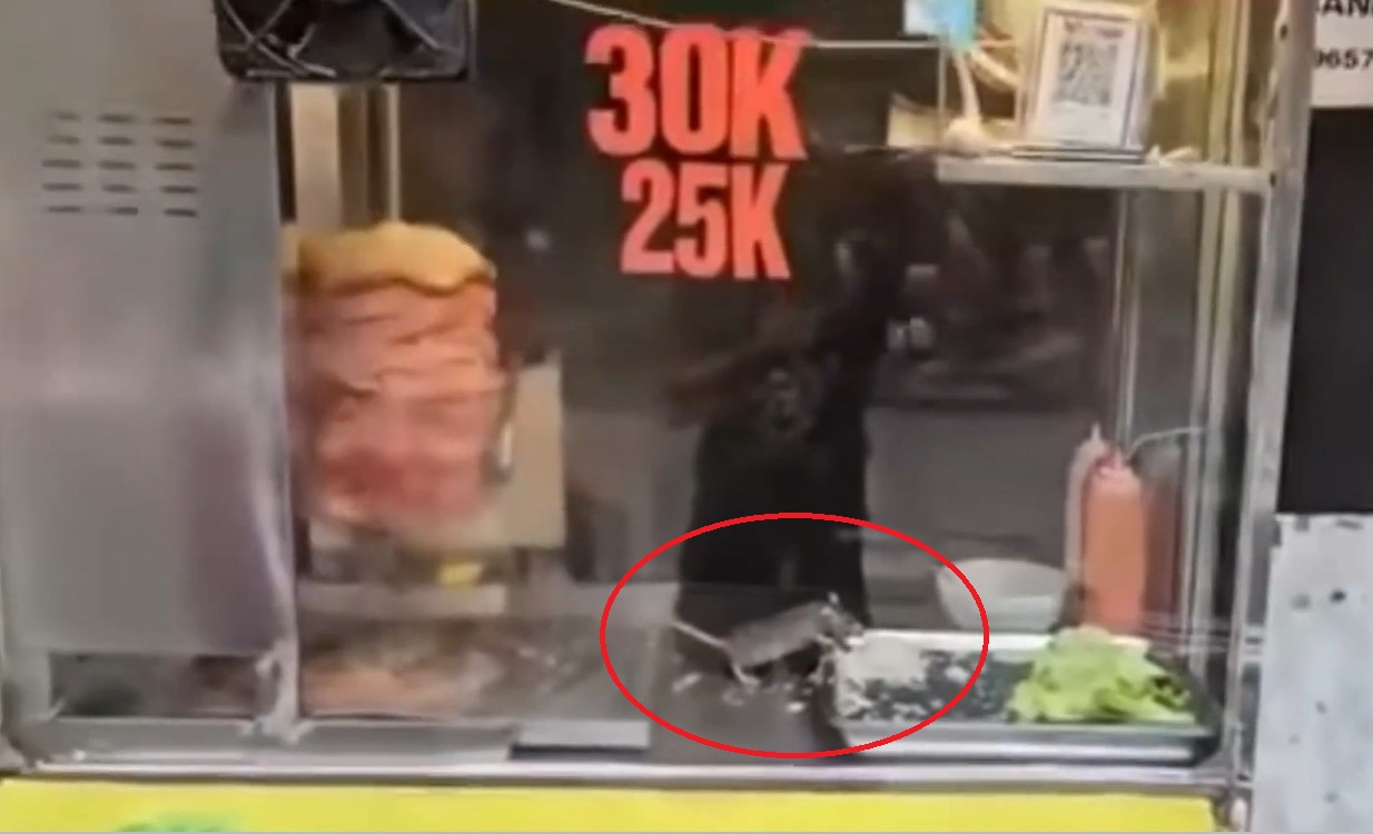 Sáng hôm qua (18/12), trên mạng xã hội xuất hiện đoạn clip ghi lại cảnh một con chuột đang ăn rau để trên khay trong một tủ đựng đồ bán bánh mì, bên cạnh là trục thịt vẫn còn đang quay.