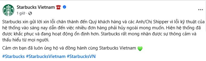 Trên trang Fanpage chính thức, Starbucks Vietnam cũng đã đăng tải thông báo khẩn, gửi lời xin lỗi chân thành đến khách hàng và đặc biệt là các đối tác tài xế (shipper). "Starbucks xin gửi lời xin lỗi chân thành đến Quý khách hàng và các Anh/Chị Shipper vì lỗi kỹ thuật của hệ thống vào sáng nay dẫn đến việc nhiều đơn hàng phải hủy ngoài mong muốn" , trích thông báo của hãng.