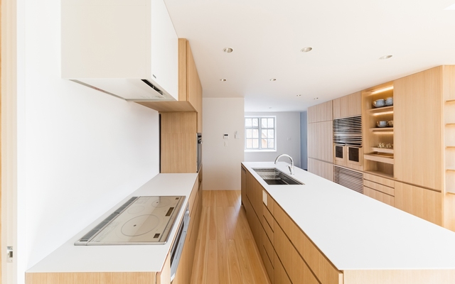 Phong cách Nhật Bản tối giản kết hợp mặt bếp trắng với tủ gỗ sáng màu và ánh sáng tự nhiên tạo nên không gian an yên và tinh giản.