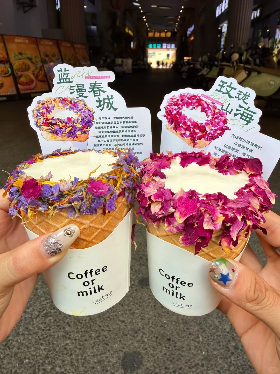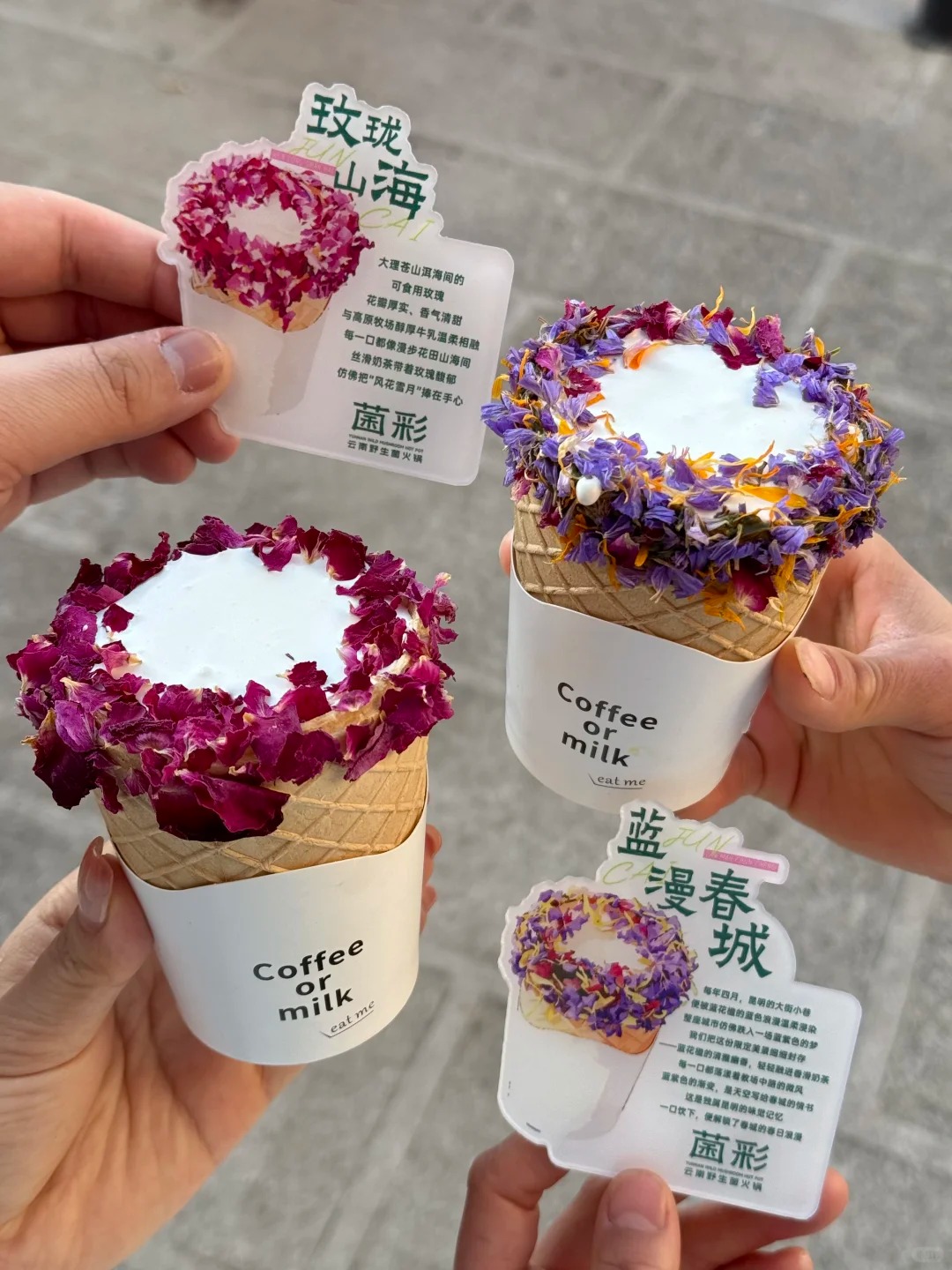 Bữa tiệc mĩ vị tại Tây Song Bản Nạp sẽ thật thiếu sót nếu thiếu đi những thức uống mang đậm tính nghệ thuật. Những ly nước mang cái tên mỹ miều như "Mân Long Sơn Hải" hay "Lam Mạn Sơn Thành" không chỉ đơn thuần là đồ uống giải khát. Bằng sự tỉ mỉ, người pha chế đã đính kết một vòng hoa tươi rực rỡ bao quanh miệng ly trà sữa yến mạch, biến thứ đồ uống bình dị trở thành một tác phẩm hoàn hảo khiến ai nhìn cũng muốn đưa máy lên chụp ngay một bức ảnh kỉ niệm.