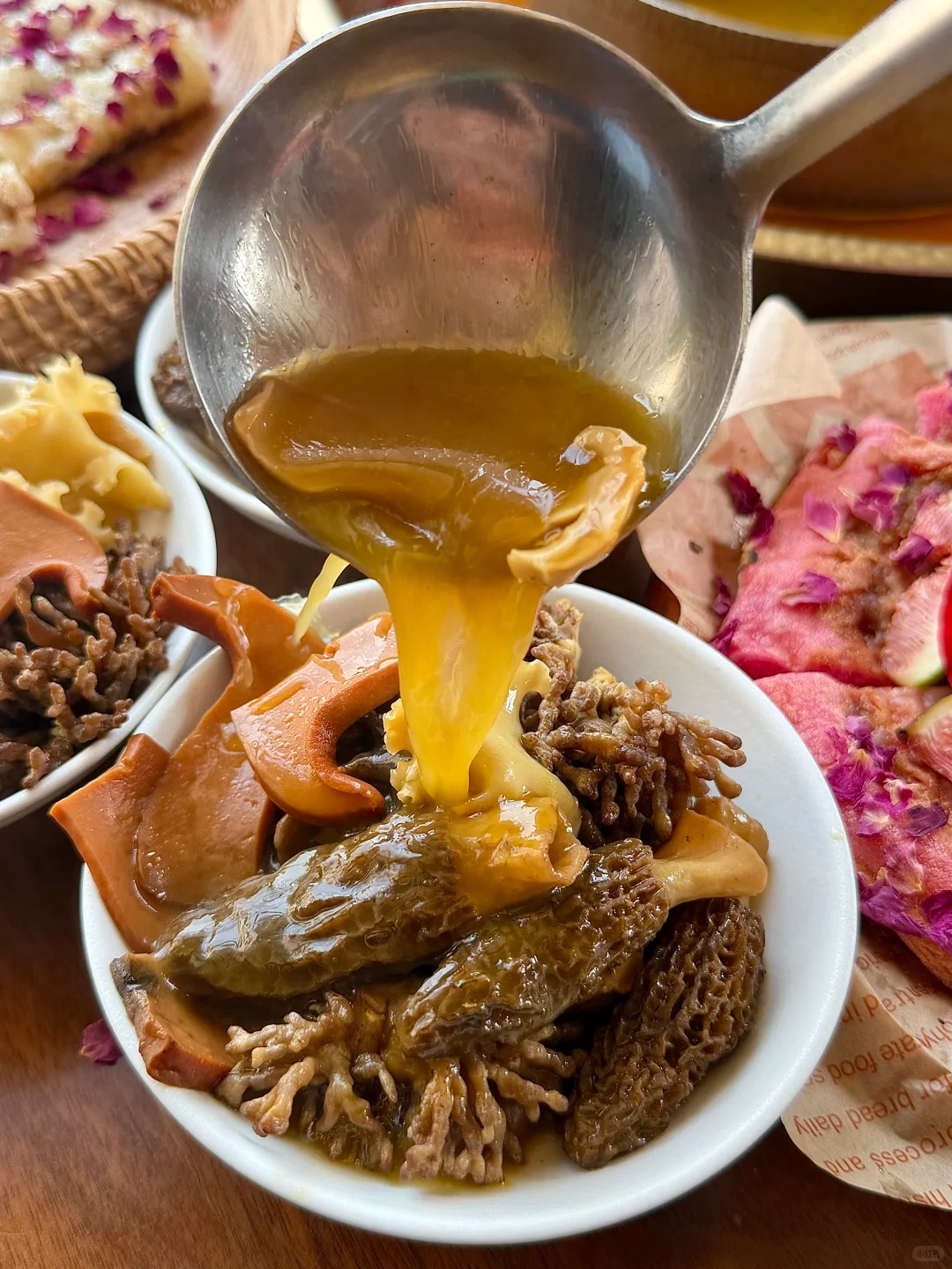 Cảm giác này có đôi chút gợi nhớ đến chiếc bánh tráng nướng mộc mạc của Đà Lạt quen thuộc với người Việt, nhưng lại mang một phong vị và đẳng cấp hoàn toàn khác biệt. Khi cắn một miếng lúc chiếc bánh vừa được đưa ra khỏi lò, độ nóng hổi làm chảy lớp phô mai béo ngậy, quyện chặt lấy vị mằn mặn, cái ngòn ngọt, dẻo thơm của nấm và chút chát nhẹ, thanh tao của hoa hồng.