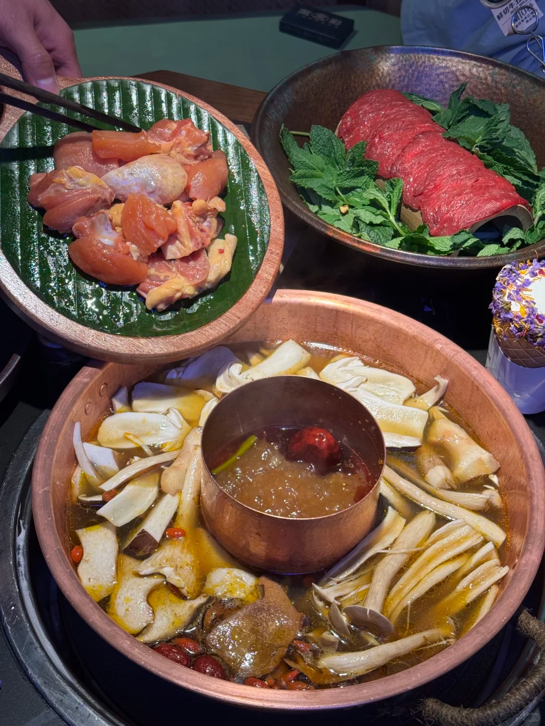 Khi nước dùng sôi sùng sục, người ta sẽ thả vào đó một "bảo tàng" nấm rừng tinh túy nhất từ nấm bụng dê dai giòn, nấm thông thịt dày ngậy béo, cho đến loại nấm "kiến thủ thanh" đổi màu huyền thoại mọc dưới những tán thông già. Việc đầu tiên cần làm không phải là vội vã gắp thức ăn, mà là múc một bát nước dùng trong vắt, thổi nhẹ và húp một ngụm thật sâu. Cái ngọt thanh khiết len lỏi vào dạ dày, làm ấm bừng cả cơ thể. Từng miếng nấm sau khi luộc chín kỹ có độ giòn sần sật, nhai đến đâu vị ngọt tự nhiên ứa ra đến đó, càng ăn càng thấy cuốn mà không hề vương lại chút cảm giác nặng nề.