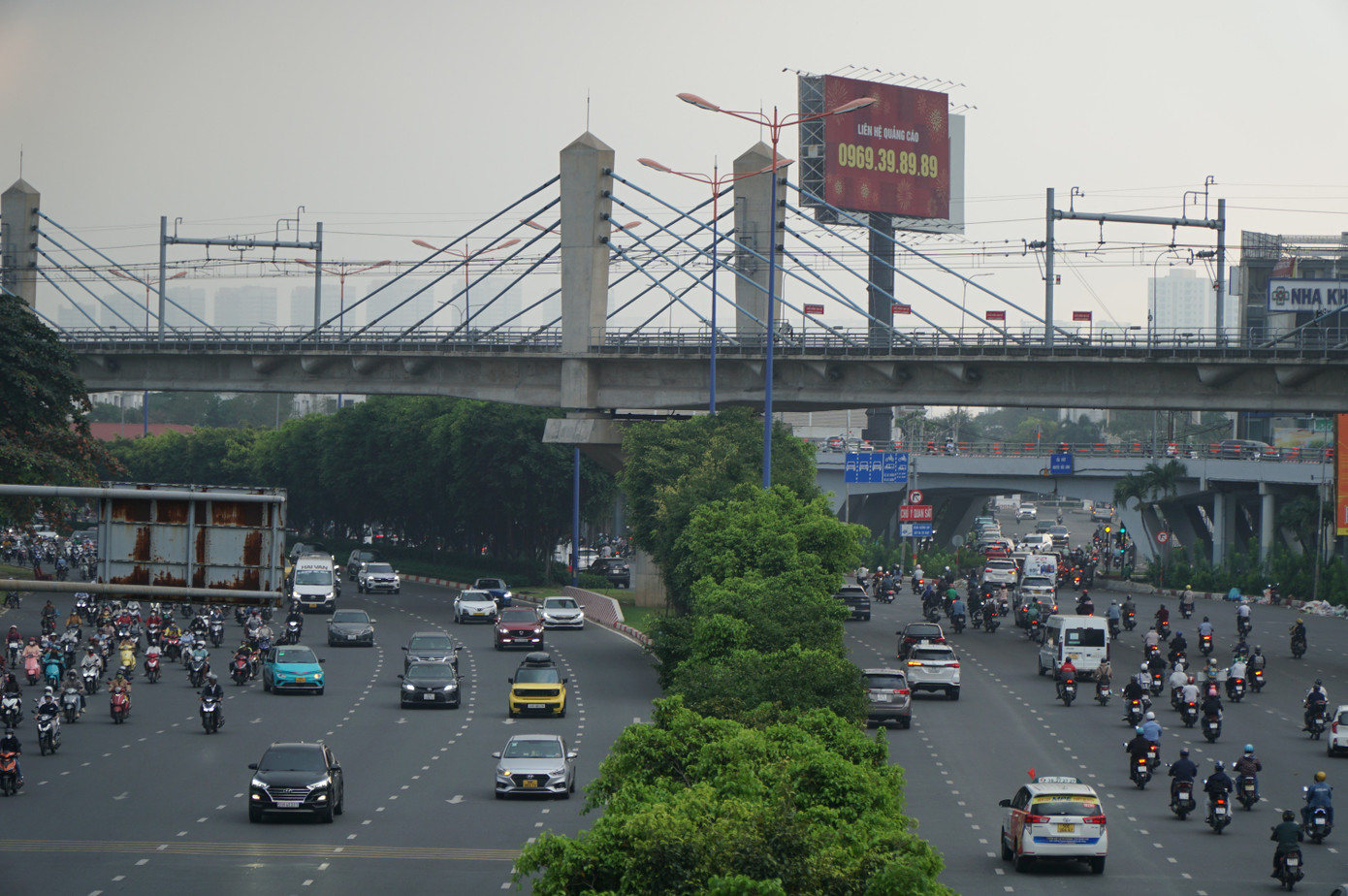 Trên các trục giao thông lớn như Võ Văn Kiệt, Xa lộ Hà Nội,… có thời điểm tầm nhìn giảm rõ rệt, người tham gia giao thông phải bật đèn xe để bảo đảm an toàn.