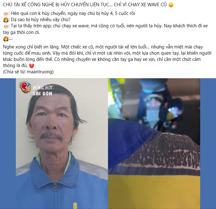 Ngày 23/12, mạng xã hội lan truyền câu chuyện cảm động về một chú tài xế xe ôm công nghệ đã lớn tuổi, thường xuyên bị khách huỷ chuyến chỉ vì chạy chiếc xe Wave cũ kỹ. Theo chia sẻ được lan truyền trên mạng, chú tài xế là người đã ngoài 60 tuổi, vẫn miệt mài mưu sinh mỗi ngày bằng chiếc xe Wave cũ. Tuy nhiên, không ít lần chú phải chịu cảnh khách hàng huỷ chuyến khi thấy phương tiện của mình quá cũ kỹ hay ngoại hình không còn nhanh nhẹn như những tài xế trẻ tuổi khác. Dù vậy, chú vẫn vui vẻ, giữ thái độ kiên nhẫn và nụ cười hiền hậu trong mỗi chặng đường mưu sinh.