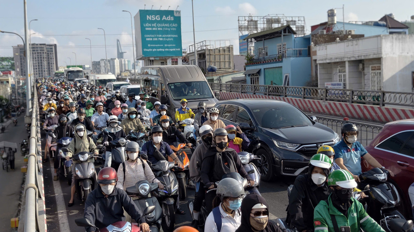 Tại giao lộ Ngô Thị Bì – Nguyễn Hữu Thọ, hàng nghìn phương tiện chen chúc, nhiều người chạy xe máy tràn lên vỉa hè nhưng vẫn không thể thoát kẹt.