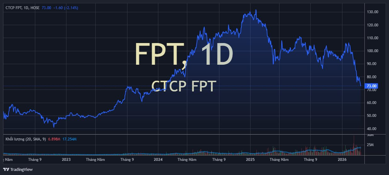 Trên thị trường, cổ phiếu FPT hiện đang "dò đáy" 2 năm quanh vùng 73.000 đồng/cp, vốn hóa còn khoảng 124.000 tỷ đồng.