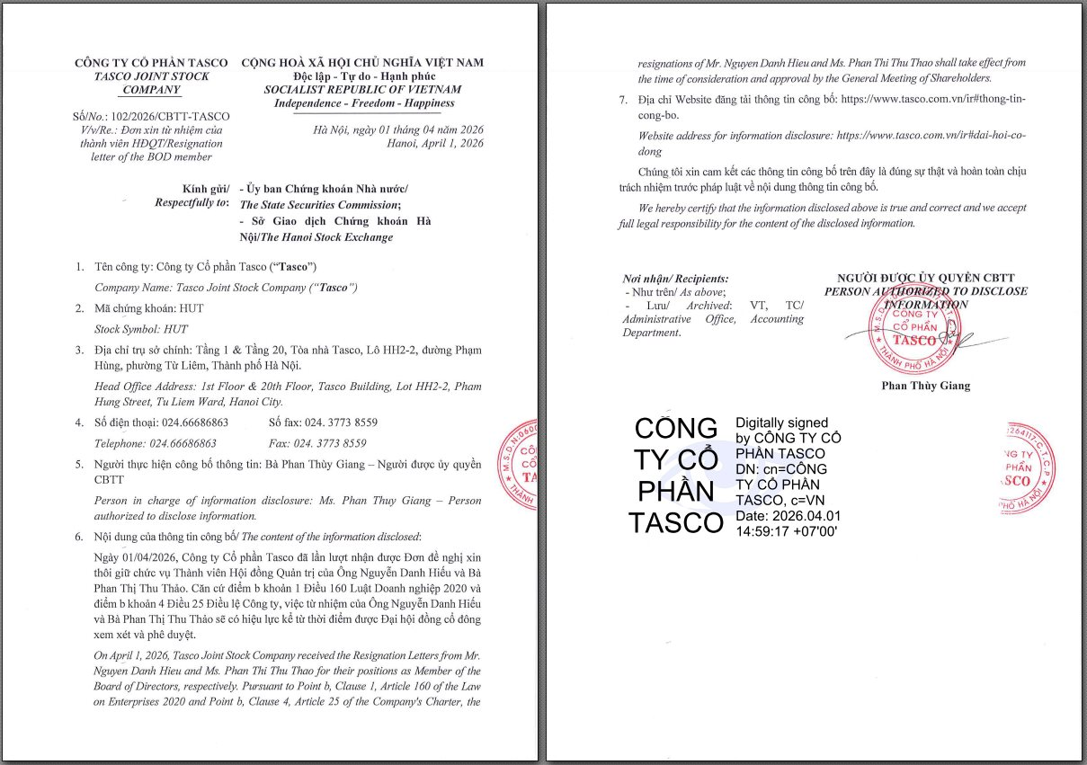 Cụ thể, ngày 1/4/2026, Tasco đã lần lượt nhận được Đơn đề nghị xin thôi giữ chức vụ Thành viên HĐQT của ông Nguyễn Danh Hiếu và bà Phan Thị Thu Thảo. Việc từ nhiệm của ông Hiếu và bà Thảo sẽ có hiệu lực kể từ thời điểm được ĐHĐCĐ xem xét và phê duyệt.