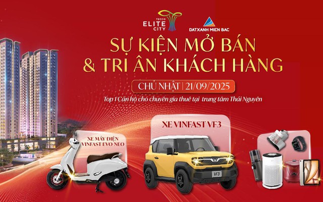 Nhằm tri ân sự đồng hành của khách hàng, ngày 21/9/2025 tới đây Công ty Cổ phần Dịch vụ và Địa ốc Đất Xanh Miền Bắc – Đơn vị phát triển kinh doanh Tecco Elite City phối hợp cùng chủ đầu tư Tecco Hà Nội sẽ tổ chức sự kiện mở bán và tri ân đặc biệt. Tại sự kiện, khách hàng mua căn hộ* có cơ hội bốc thăm trúng thưởng với tổng giá trị lên tới 400 triệu đồng gồm ô tô VinFast VF3, xe máy điện VinFast EVO Neo, iPad Air M3, Apple Watch SE2 và cùng nhiều phần quà giá trị.