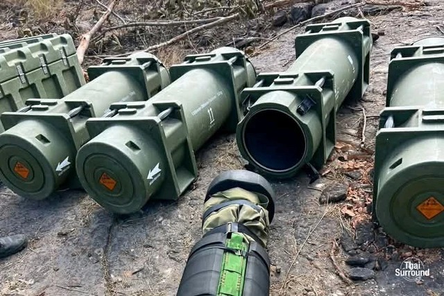 Thái Lan thu giữ một số tên lửa chống tăng dẫn đường chính xác GAM-102LR do Trung Quốc sản xuất sau khi tấn công một căn cứ của Campuchia. Ảnh: Thai Surround