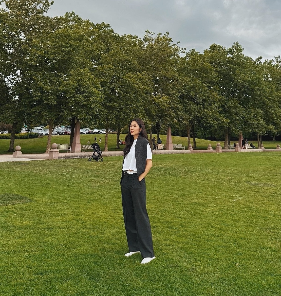 Cô thường chọn quần ống rộng chất liệu vải mềm, gam màu nhã nhặn như đen, xanh nhạt. Khi kết hợp cùng áo thun hoặc áo hai dây tối giản, tổng thể vừa phóng khoáng vừa tinh tế.