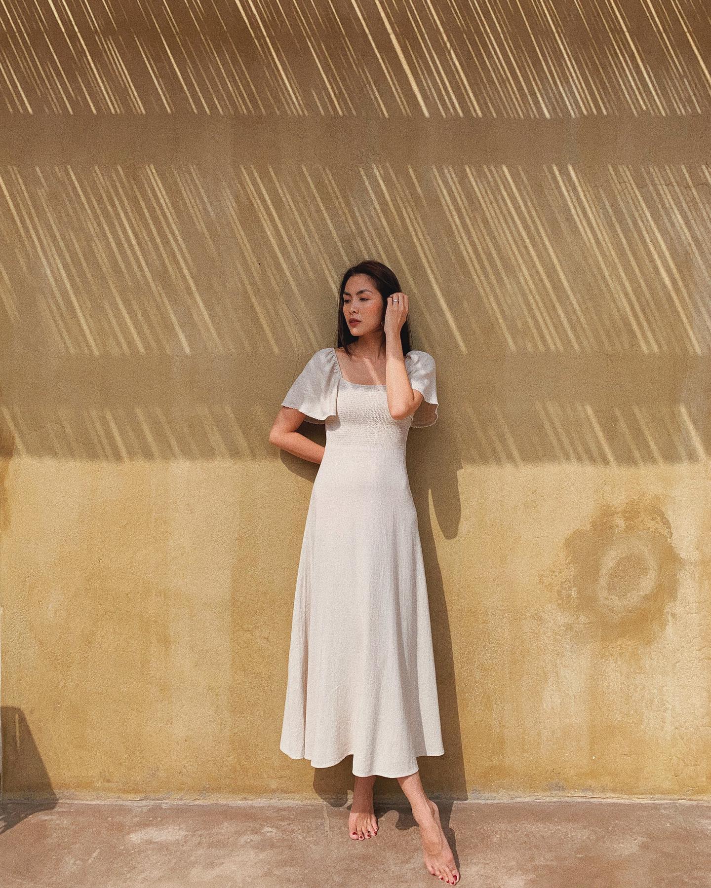 Điểm đặc trưng trong cách chọn váy của cô là hạn chế họa tiết quá rực rỡ. Thay vào đó là những gam màu pastel, trắng ngà hoặc họa tiết hoa nhí tinh tế. Phối cùng sandal mảnh và túi cói, tổng thể trở nên hài hòa, đúng tinh thần nghỉ dưỡng.