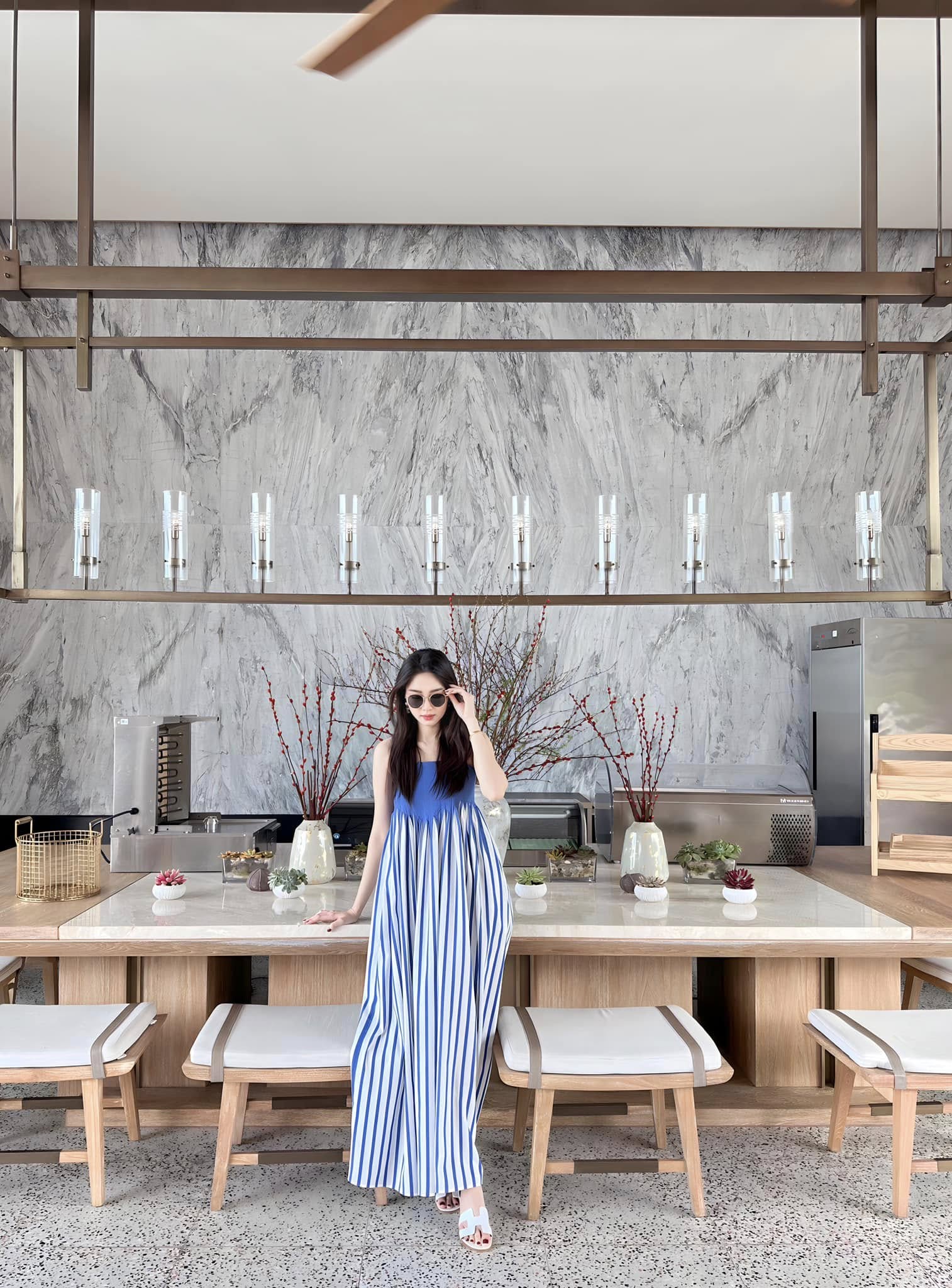 Một chiếc váy maxi dáng dài với họa tiết kẻ sọc là lựa chọn lý tưởng để mặc đẹp mà không cần mix & match cầu kỳ. Thiết kế mang đậm vibe đi biển, vừa thoải mái vừa bắt mắt. Đặng Thu Thảo chọn kết hợp cùng một đôi sandal đơn giản, càng tôn lên vẻ phóng khoáng và nhẹ nhàng của tổng thể.