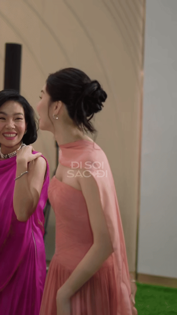 Ngay cả style đi đám cưới của Đặng Thu Thảo cũng đẹp quên lối về. luôn ghi điểm nhờ sự tinh tế và thanh lịch. Dự đám cưới của Tiên Nguyễn, nàng Hậu chọn diện một chiếc đầm cúp ngực dáng dài, gam hồng ngọt ngào giúp tôn lên vẻ ngoài dịu dàng, thanh thoát. Điểm nhấn vạt vắt vai được xử lý khéo léo không chỉ tạo nét mềm mại mà còn giúp tổng thể thêm phần sang trọng, trang nhã.