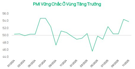 Chỉ số PMI đạt 53,8 điểm, duy trì vững chắc trong vùng tăng trưởng và cho thấy doanh nghiệp tiếp tục giữ kỳ vọng tích cực trong tháng thứ năm liên tiếp, với gần một nửa số doanh nghiệp khảo sát dự báo sản lượng sẽ tăng trong năm tới.