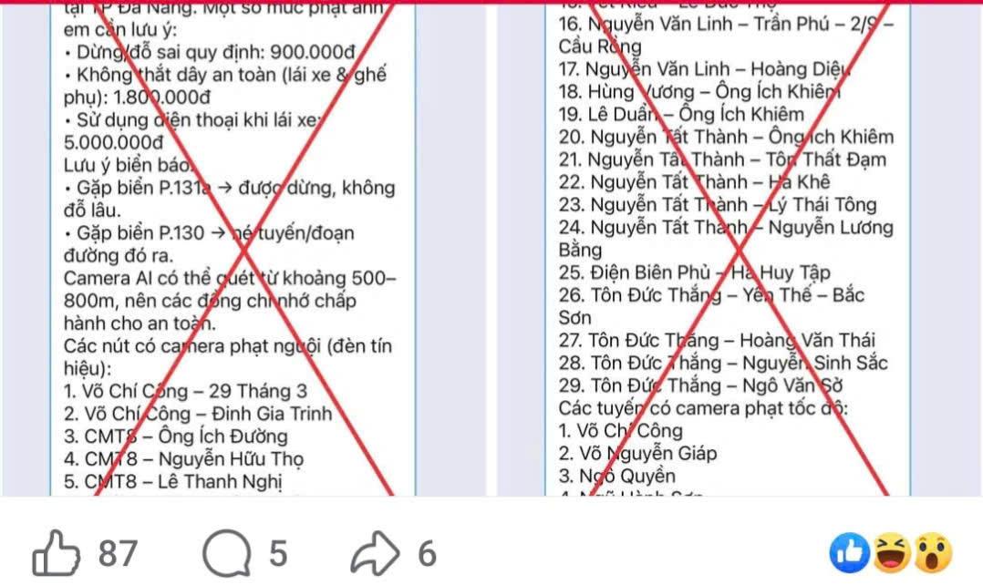 Công an Đà Nẵng thông báo, những nội dung lan truyền về camera AI phạt nguội giao thông tại thành phố đều sai sự thực.