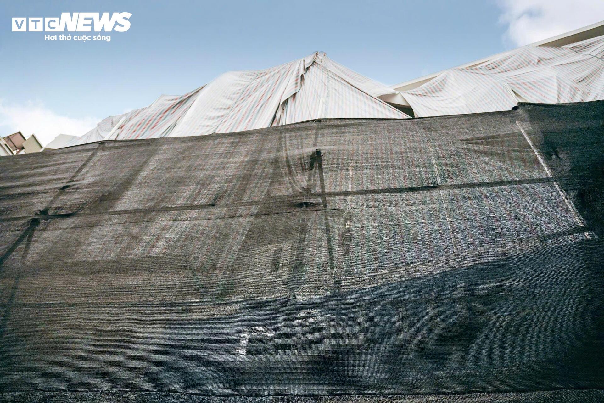 Những khu nhà từng đông đúc nay chuyển thành công trường, máy móc cơ giới hoạt động liên tục để san gạt, thu dọn, chuẩn bị mặt bằng. Khu vực thi công được quây rào, che lưới và phun nước giảm bụi, hạn chế tiếng ồn.