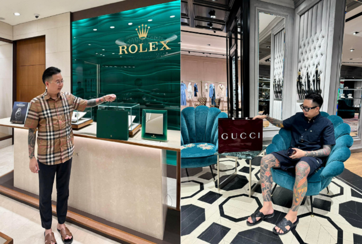 Trong một lần ngẫu hứng "bóc giá" trang phục thường ngày, chàng trai 9X khiến cõi mạng phải choáng váng thực sự: Quần tây sương sương 1,1 triệu, áo sơ mi Burberry 11 triệu, thắt lưng Louis Vuitton 16 triệu đồng nhưng điểm nhấn là chiếc mặt dây lưng bằng vàng nguyên khối đính kim cương giá lên tới 180 triệu. Chưa kể, trên tay anh là chiếc đồng hồ Rolex ngót nghét 300 triệu, đeo kính mắt họa tiết vàng, đến cả chiếc móc khóa ô tô Mercedes cũng phải làm bằng vàng 18K cho "tông xuyệt tông".
