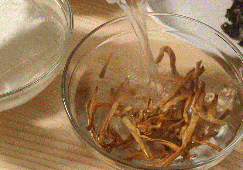 Nguyên liệu: 15g nụ hoa hiên khô, 50g giá đỗ, 10g mộc nhĩ khô, nửa khối đậu phụ, 1 lát gừng, một chút muối.