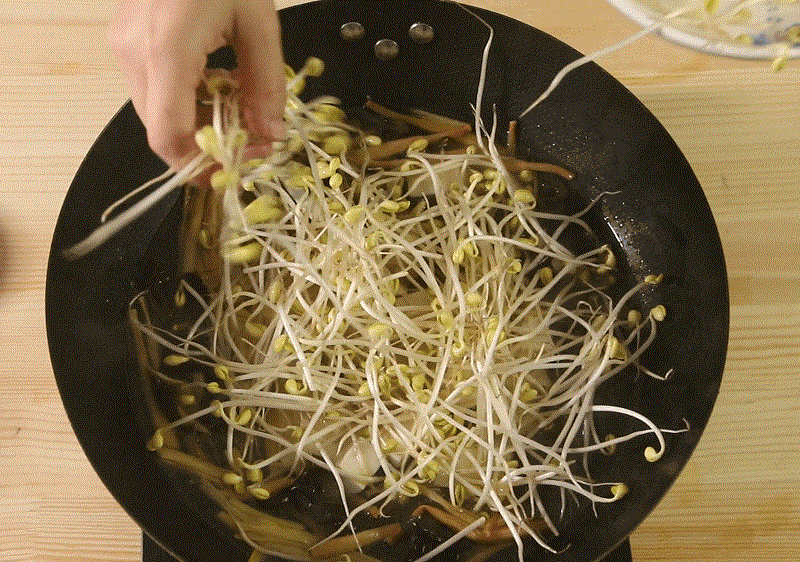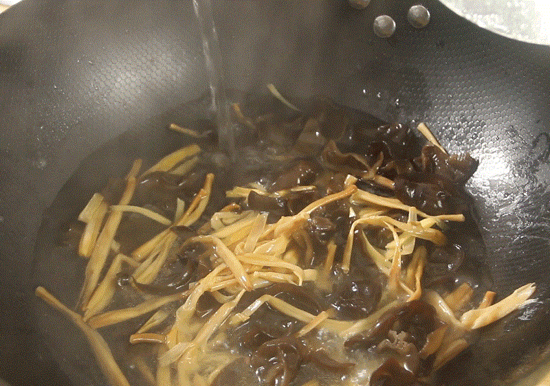 Bước 2: Cho nước vào nồi, thêm lát gừng, nụ hoa hiên và mộc nhĩ, đun sôi trên lửa lớn. Sau đó giảm lửa nhỏ và nấu trong 8 phút. Cho giá đỗ và đậu phụ chiên vào, tiếp tục nấu trong 3 phút, thêm chút muối cho vừa ăn, tắt bếp và món ăn đã sẵn sàng để thưởng thức.