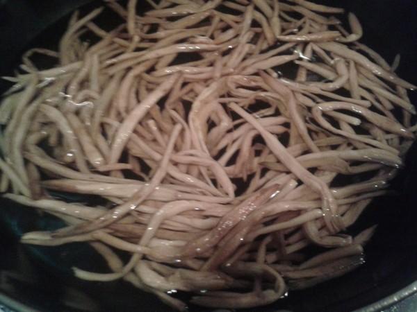 Bước 1: Ngâm hoa hiên khô trong nước ấm khoảng 15 phút cho đến khi mềm. Rửa sạch để loại bỏ phần cuống cứng. Sau đó luộc trong nước sôi khoảng 5 phút, vớt ra và để ráo nước. Rửa sạch rồi thái thịt vai heo thành từng lát mỏng, ướp với một chút muối, nước tương và bột bắp trong 10 phút (thịt vai heo có tỉ lệ mỡ nạc hợp lý nên sẽ không bị dai ngay cả khi ninh lâu, nước dùng sẽ đặc biệt ngon).