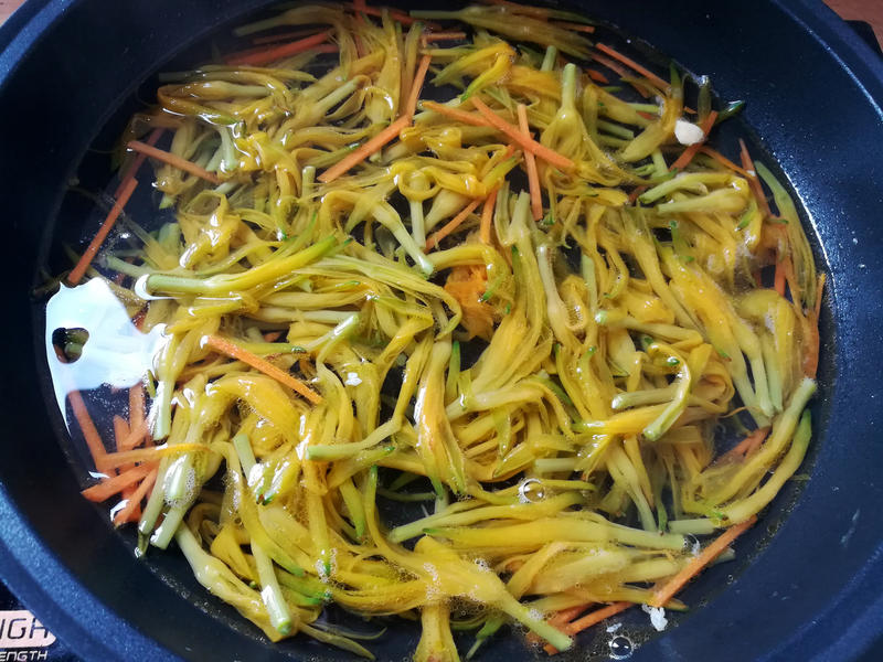 Bước 1: Ngâm nụ hoa hiên trong nước ấm khoảng 15 phút đến khi mềm rồi rửa sạch. Sau đó cho hoa hiên vào luộc khoảng 5 phút rồi vớt ra để ráo, Ngâm mộc nhĩ khô trong nước ấm rồi xé nhỏ; rửa sạch giá đỗ. Cắt đậu phụ thành những miếng nhỏ, chiên trong chảo cho đến khi bề mặt hơi vàng, rồi vớt ra để riêng. Bạn cũng có thể không cần chiên sơ đậu phụ.
