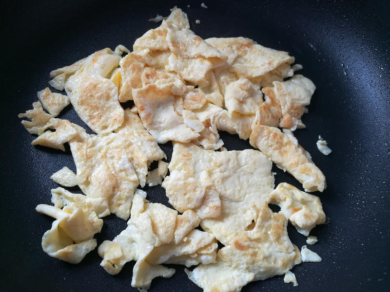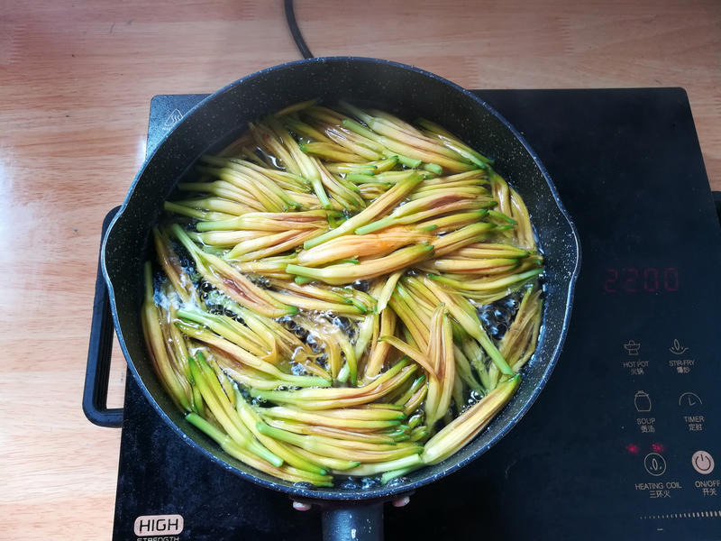 Bước 1: Ngâm và rửa sạch nụ hoa hiên, sau đó luộc trong nước sôi khoảng 5 phút. Vớt ra và để riêng. Cho một ít dầu ăn vào chảo. Khi dầu nóng, đập trứng vào và chiên đến khi vàng đều cả hai mặt. Thêm một thìa cà phê rượu nấu ăn để khử mùi tanh (nên dùng lửa nhỏ khi chiên trứng để tránh bị cháy). Sau đó dùng thìa xắt thành miếng nhỏ. Nếu bạn dùng hoa tươi, hãy loại bỏ nhị trước khi luộc.