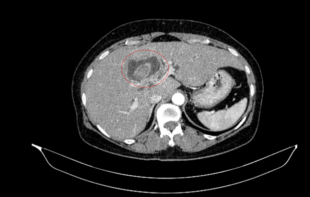 Hình ảnh sỏi đường mật tạo ổ áp xe gan - đường mật gan trái( vòng tròn màu đỏ). Giãn nhẹ đường mật trong gan hai bên. Dày thành nhẹ ngã ba đường mật trên phim chụp cắt lớp vi tính.