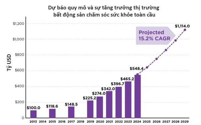 Theo báo cáo của Global Wellness Institute (GWI), thị trường bất động sản wellness toàn cầu dự kiến tăng trưởng 15,2% mỗi năm, đạt quy mô khoảng 1.114 tỷ USD vào năm 2029. Trong đó, mảng bất động sản sức khỏe - bao gồm các khu đô thị, khu nghỉ dưỡng, biệt thự, căn hộ là một trong những lĩnh vực tăng trưởng mạnh nhất, ước đạt 770 tỷ USD năm 2026.