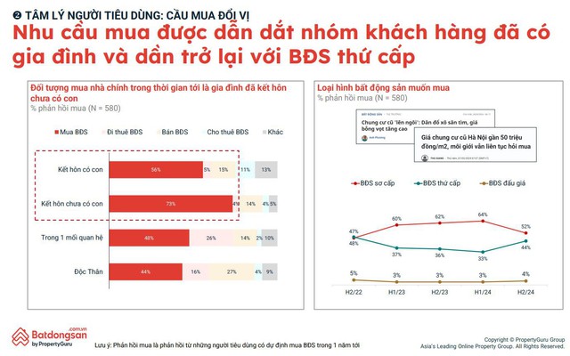 Theo Báo cáo tâm lý người tiêu dùng BĐS 2 quý đầu năm và dự báo xu hướng nửa cuối năm 2024 của Batdongsan.com.vn, nhu cầu mua nhà vẫn luôn hiện hữu trong mọi giai đoạn của thị trường (58% người được hỏi). Trong đó, nhu cầu mua nhà hiện nay được dẫn dắt bởi nhóm khách hàng đã có gia đình với tỷ lệ 56% (đối với gia đình đã có con nhỏ), 73% (vợ chồng trẻ chưa có con).