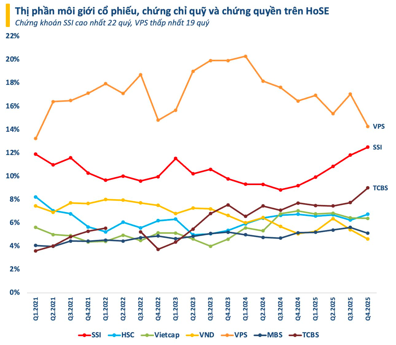 Bên cạnh SSI, TCBS cũng vươn lên mạnh mẽ với thị phần 9% trong quý 4/2025, nới rộng khoảng cách so với tốp phía sau. VPBankS cũng có lần đầu tiên lọt top 10 thị phần môi giới trên HoSE. Ở chiều ngược lại, VPS dù vẫn dẫn đầu nhưng thị phần đã bị thu hẹp đáng kể xuống mức thấp nhất 19 quý.