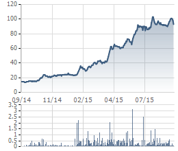 Đầu tiên phải kể đến HTL của ô tô Trường Long. Khởi điểm đầu năm với mức giá gần 25.000 đồng/cổ phiếu, cổ phiếu HTL đã đạt gấp 4 lần tương đương tăng trưởng 300%. Nếu tính quãng thời gian 1 năm, ai giữ cổ phiếu HTL từ tháng 9 năm ngoái thì tháng 9 năm nay có thể vui hơn nhiều lần khi cổ phiếu đạt mức tăng trưởng hơn 560%!