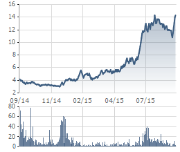 Một cổ phiếu tăng mạnh khác là TNT của Công ty cổ phần Tài Nguyên. Từ mức giá “ly trà đá” đầu năm 2015 (khoảng 4.000 đồng/cổ phiếu), TNT đã đạt mức giá gần 15.000 đồng/cổ phiếu những phiên gần đây. Giá tăng 3,5 lần trong chưa đầy 3 quý.