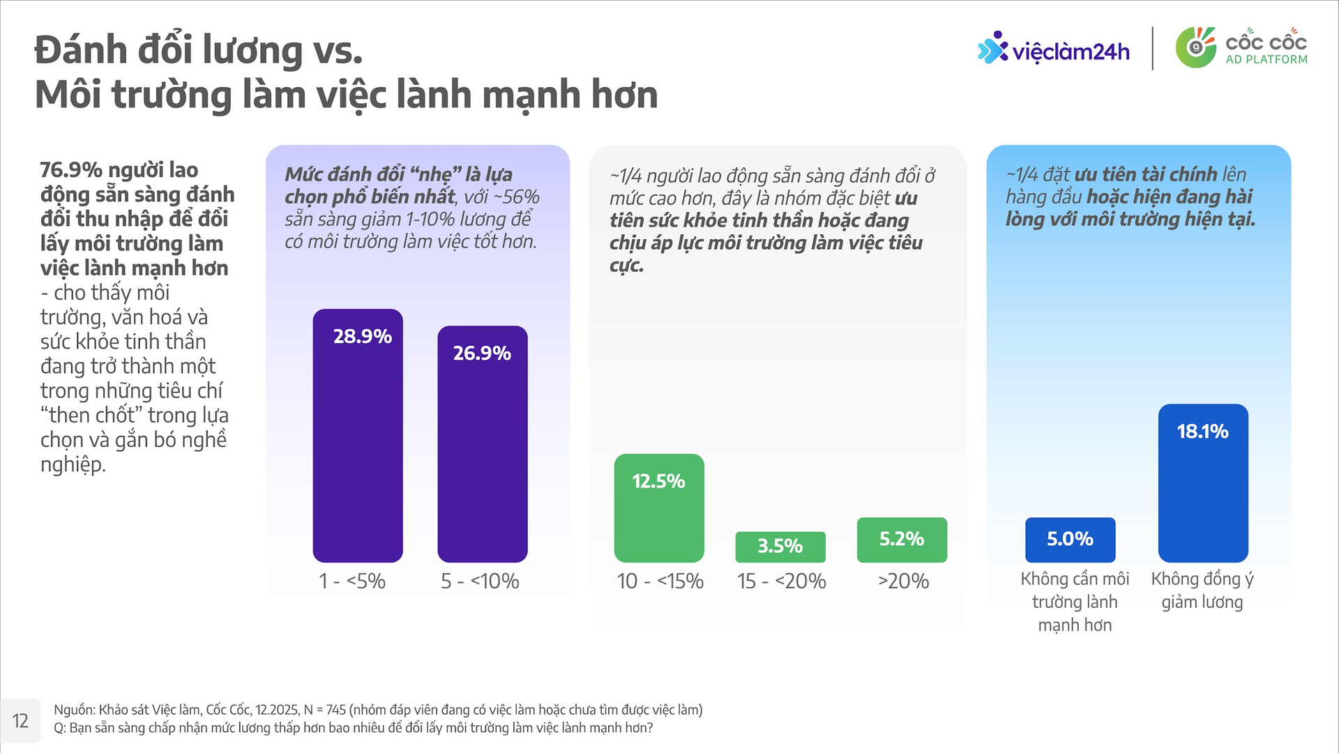 Báo cáo ghi nhận sự dịch chuyển rõ rệt trong hệ giá trị nghề nghiệp của người lao động. Dù tiền lương và phúc lợi vẫn là nền tảng tạo cảm giác “ổn định” (40%) nhưng thu nhập không còn là yếu tố được đặt lên hàng đầu. Cụ thể, 76,9% người lao động sẵn sàng lựa chọn môi trường làm việc lành mạnh, tôn trọng và cân bằng hơn, ngay cả khi phải đánh đổi mức lương cao hơn. Với Gen Z, con số này còn rõ nét hơn khi 60,8% sẵn sàng chấp nhận giảm 1-10% thu nhập để đổi lấy môi trường làm việc phù hợp.