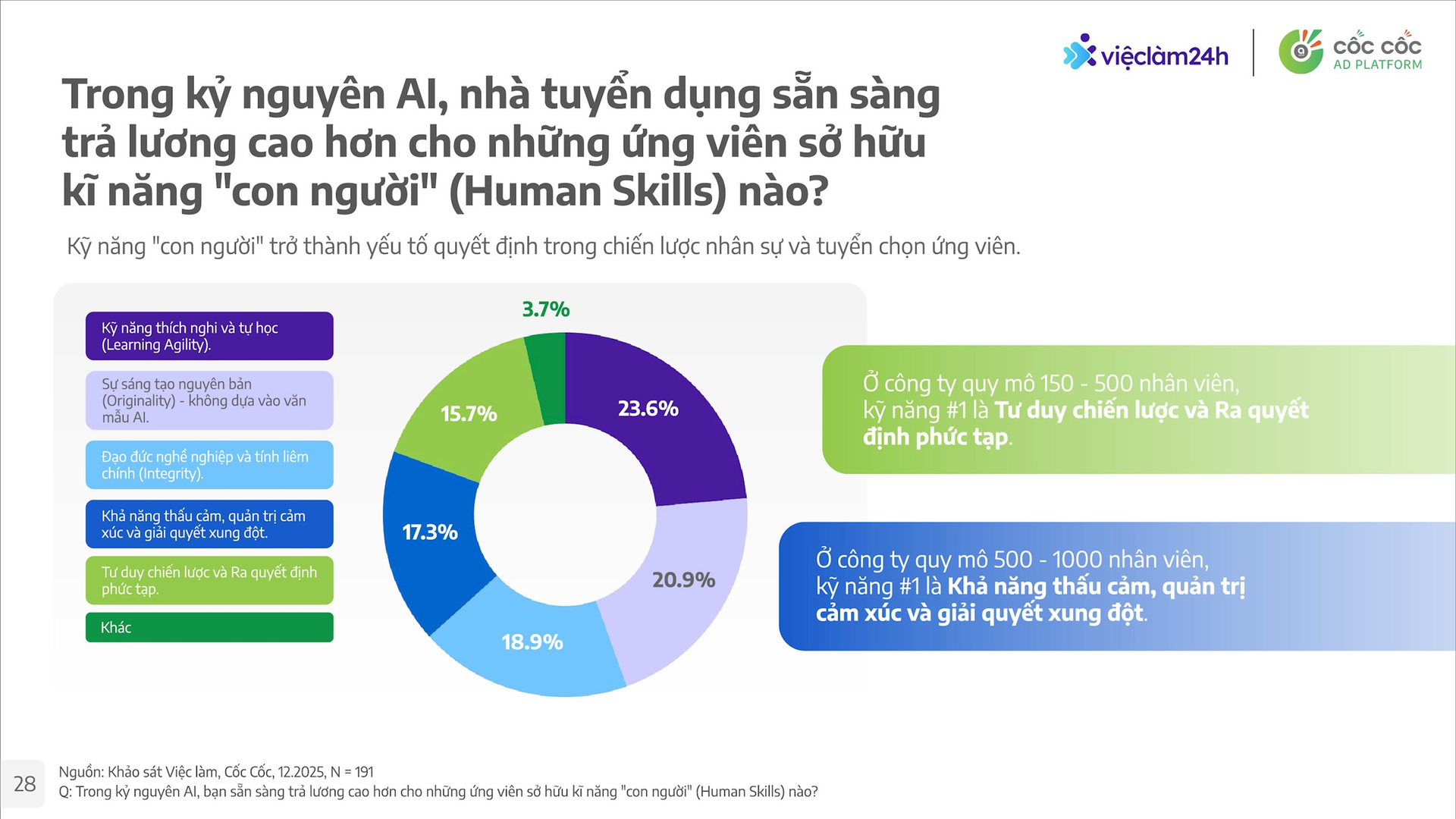 Trong bối cảnh AI ngày càng phổ biến, tiêu chí tuyển dụng cũng dịch chuyển theo hướng ưu tiên các kỹ năng thể hiện năng lực gốc của con người như khả năng thích nghi, tư duy độc lập, sáng tạo và quản trị cảm xúc. Việc thành thạo các công cụ AI cơ bản, trong nhiều trường hợp, đã trở thành yêu cầu nền tảng thay vì lợi thế cạnh tranh.