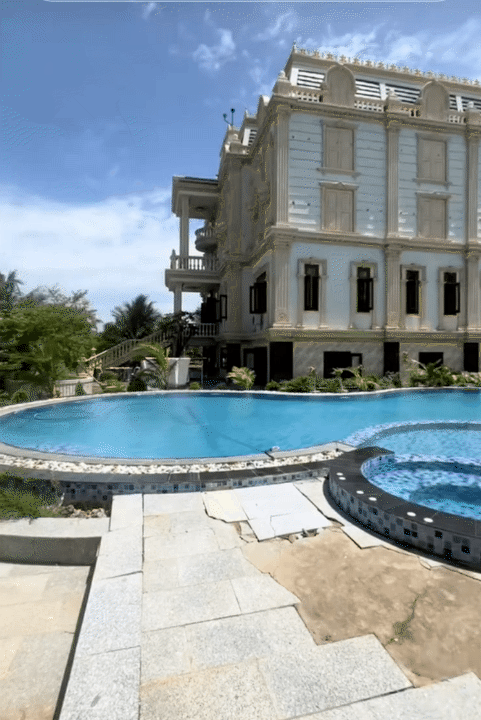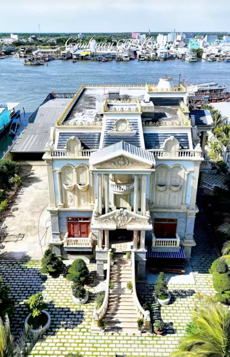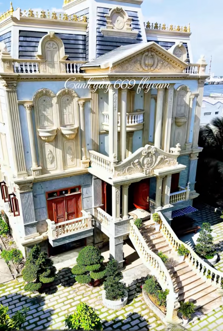 Tòa dinh thự mang tông màu trắng ngà nổi bật, cao khoảng 3-4 tầng, với kiến trúc bề thế và sang trọng. Chỉ cần nhìn từ bên ngoài, nhiều người đã không khỏi bất ngờ trước quy mô của căn dinh thự. Dù chưa nhắc đến nội thất bên trong, riêng phần kiến trúc và khuôn viên đã đủ cho thấy sự đầu tư và tiềm lực của gia đình.