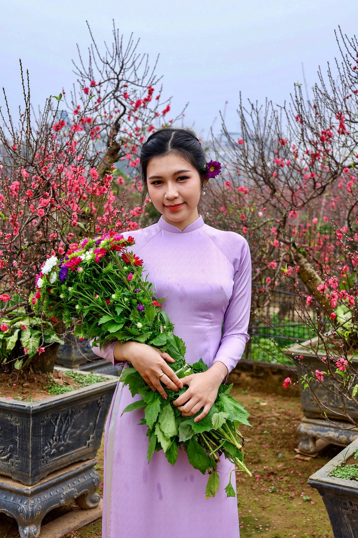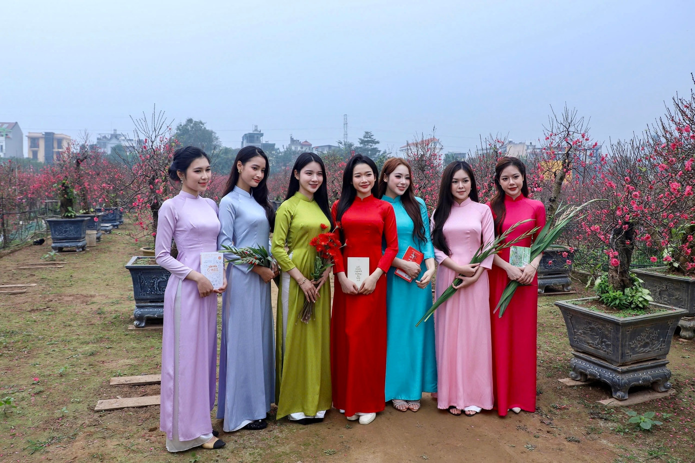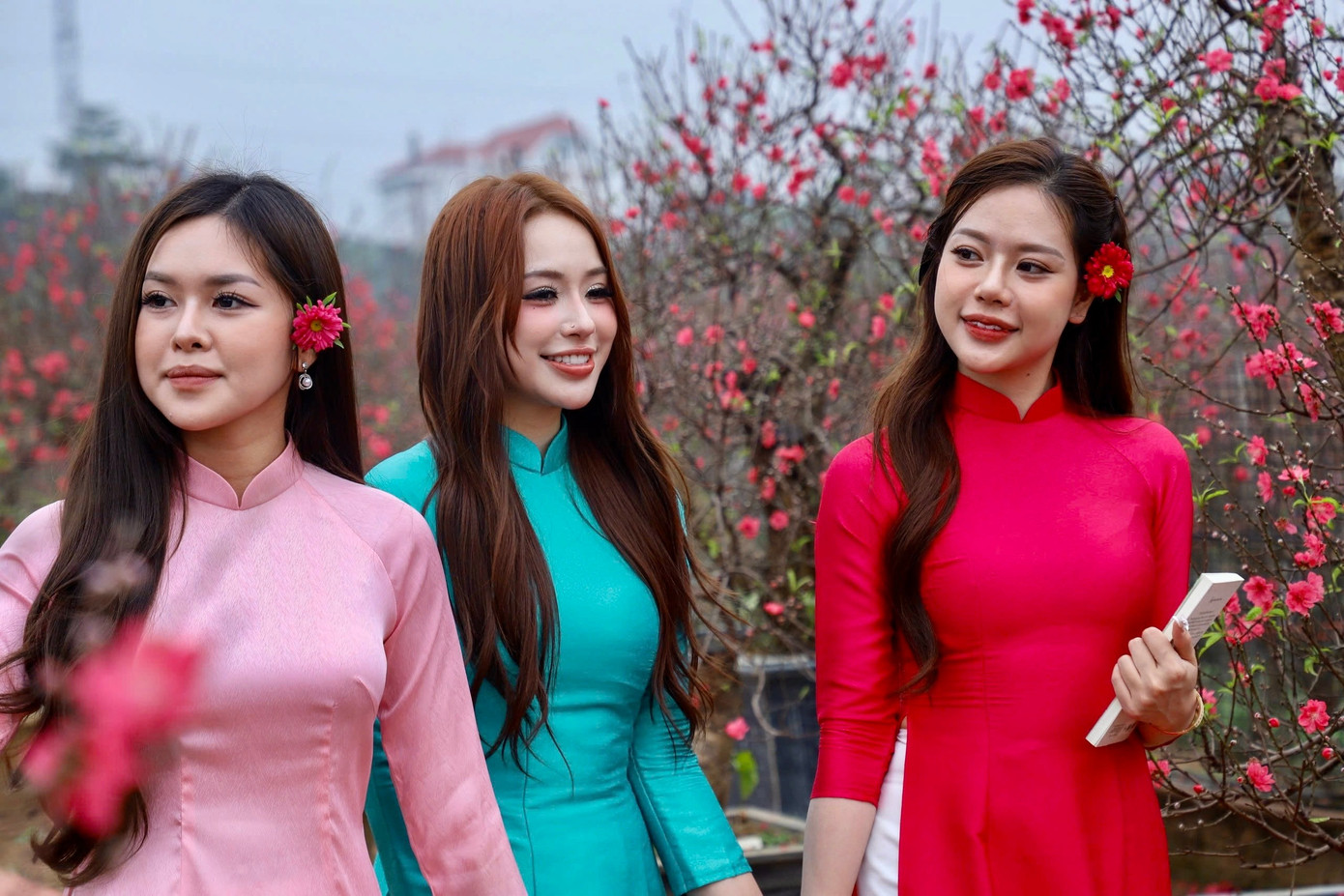 Thiếu nữ xúng xính áo dài, check-in vườn đào Nhật Tân