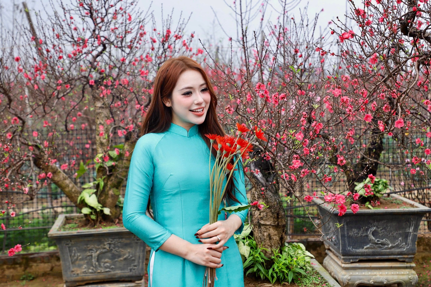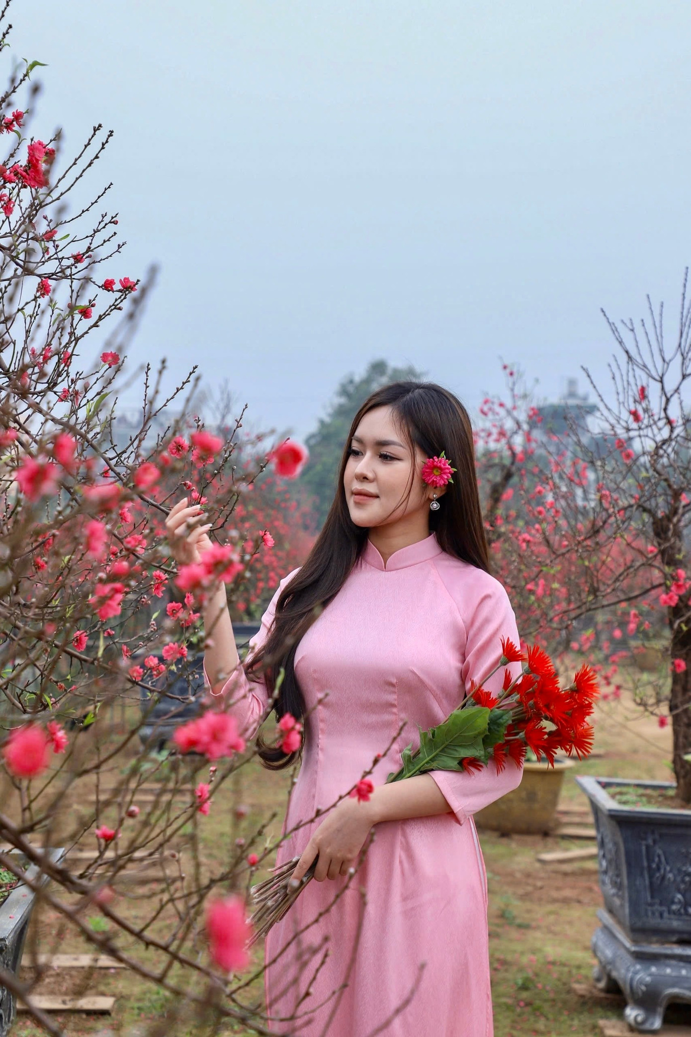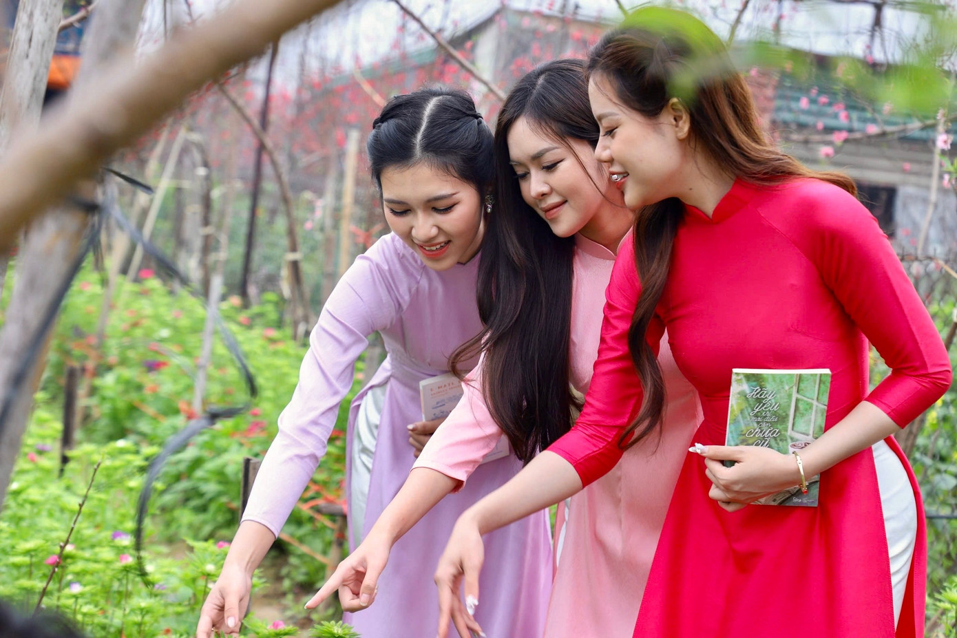 Thiếu nữ xúng xính áo dài, check-in vườn đào Nhật Tân