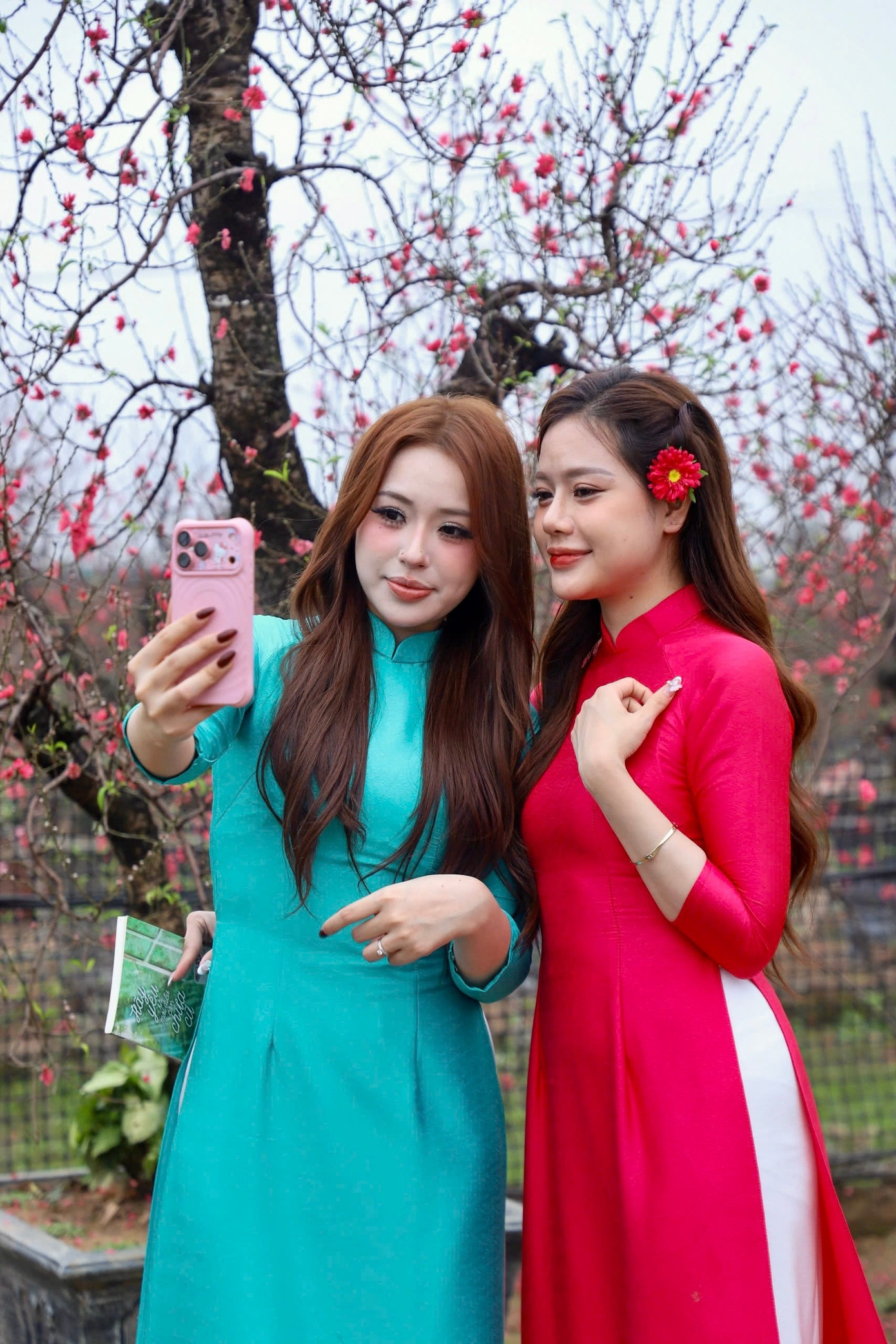 Dịp Tết, vườn đào Nhật Tân trở thành điểm hẹn quen thuộc của nhiều bạn trẻ Hà Thành. Giữa sắc hồng của đào đang độ đẹp nhất, từng nhóm bạn trẻ rủ nhau diện áo dài, rạng rỡ tạo dáng trước ống kính.
