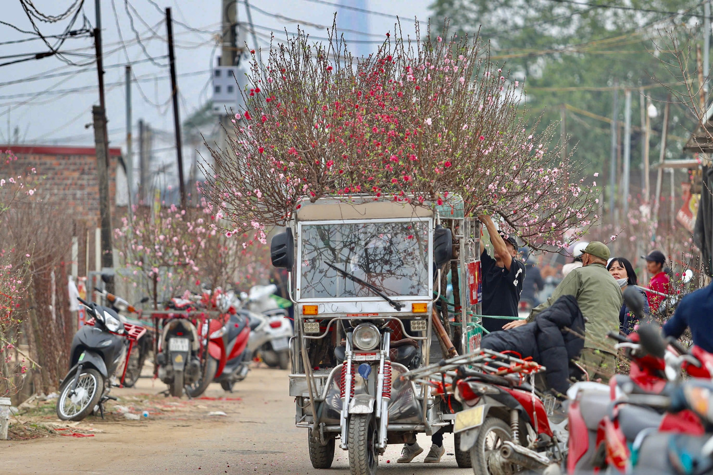 Thời điểm này, các vườn đào Nhật Tân tất bật xe chở đào của thương lái ra vào, nhộn nhịp những người đến check-in.